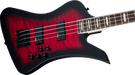 The Kelly Bird JS3Q four-string bass features a 34"-scale length, a lightweight poplar body with a quilt maple top, bolt-on maple neck with graphite reinforcement and scarf joint and a 12"-16" compound radius bound amaranth fingerboard with 21 jumbo frets and pearloid block inlays.